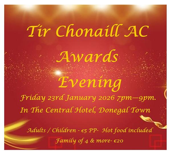 Tir Chonaill AC Awards evening will be in the The Central Hotel on the 23rd January from 7pm - 9pm. Everyone is welcome to come and celebrate 🎉 our athletes achievements for 2025.